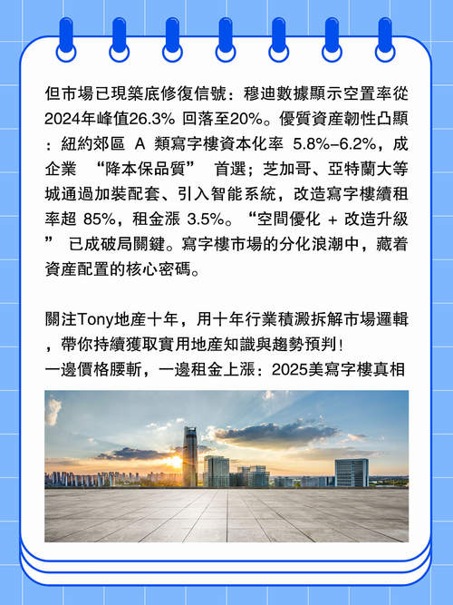 但市场已现筑底修复信号:穆迪数据显示空置率从 2024 年峰值 26.3% 回落至 20%。优质资产韧性凸显:纽约郊区 A 类写字楼资本化率 5.8%-6.2%,成企业 “降本保品质” 首选;芝加哥、亚特兰大等城通过加装配套、引入智能系统,改造写字楼续租率超 85%,租金涨 3.5%。“空间优化 + 改造升级” 已成破局关键。