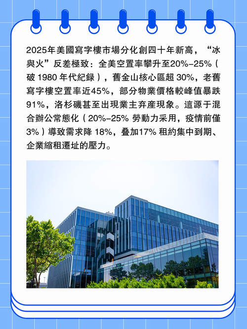 2025 年美国写字楼市场分化创四十年新高,“冰与火” 反差极致:全美空置率攀升至 20%-25%(破 1980 年代纪录),旧金山核心区超 30%,老旧写字楼空置率近 45%,部分物业价格较峰值暴跌 91%,洛杉矶甚至出现业主弃产现象。这源于混合办公常态化(20%-25% 劳动力采用,疫情前仅 3%)导致需求降 18%,叠加 17% 租约集中到期、企业缩租迁址的压力。