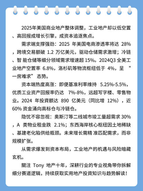 2025 年美国商业地产整体调整,工业地产却以低空置、高回报成增长引擎,成资本追逐焦点。