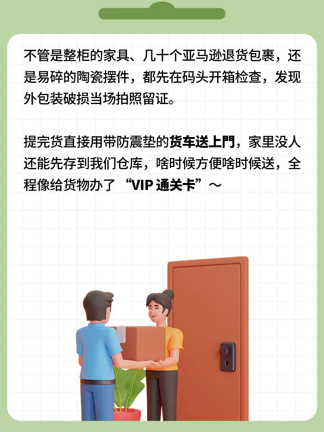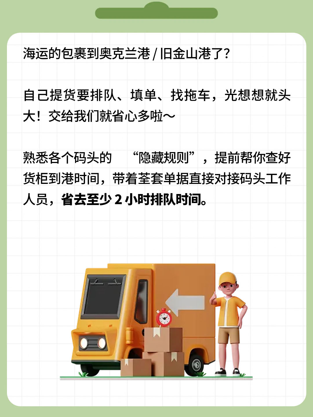 海运的包裹到奥克兰港 / 旧金山港了?自己提货要排队、填单、找拖车,光想想就头大!交给我们就省心多啦~熟悉各个码头的 “隐藏规则”,提前帮你查好货柜到港时间,带着荃套单据直接对接码头工作人员,省去至少 2 小时排队时间。不管是整柜的家具、几十个亚马逊退货包裹,还是易碎的陶瓷摆件,都先在码头开箱检查,发现外包装破损当场拍照留证。提完货直接用带防震垫的货车送上門,家里没人还能先存到我们仓库,啥时候方便啥时候送,全程像给货物办了 “VIP 通关卡”~