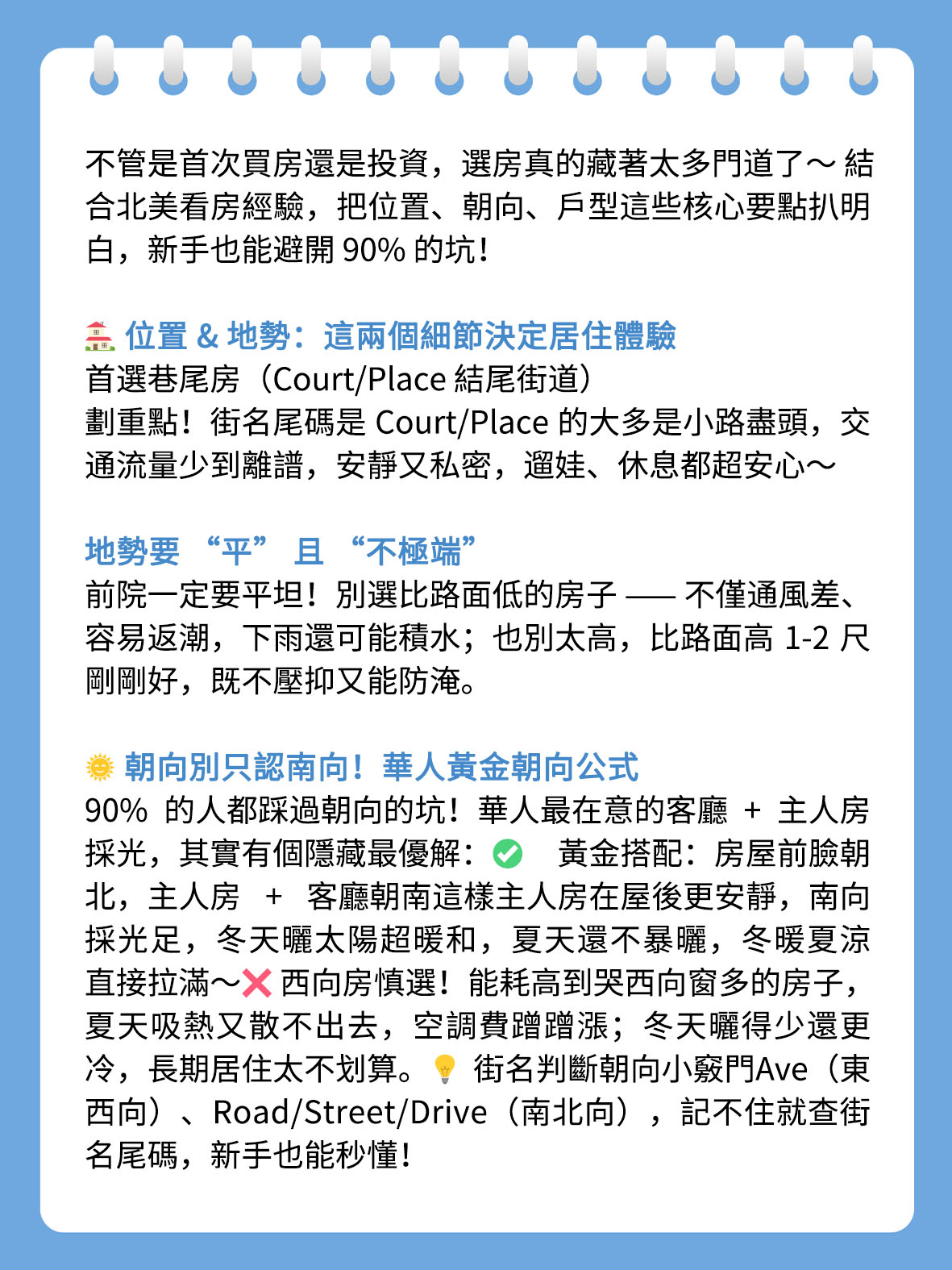 不管是首次買房還是投資,選房真的藏著太多門道了~ 結合北美看房經驗,把位置、朝向、戶型這些核心要點扒明白,新手也能避開 90% 的坑!