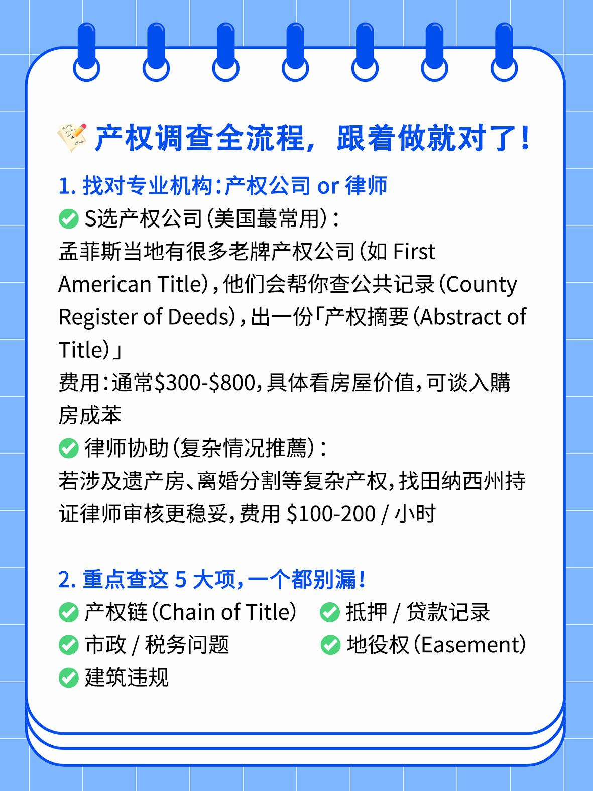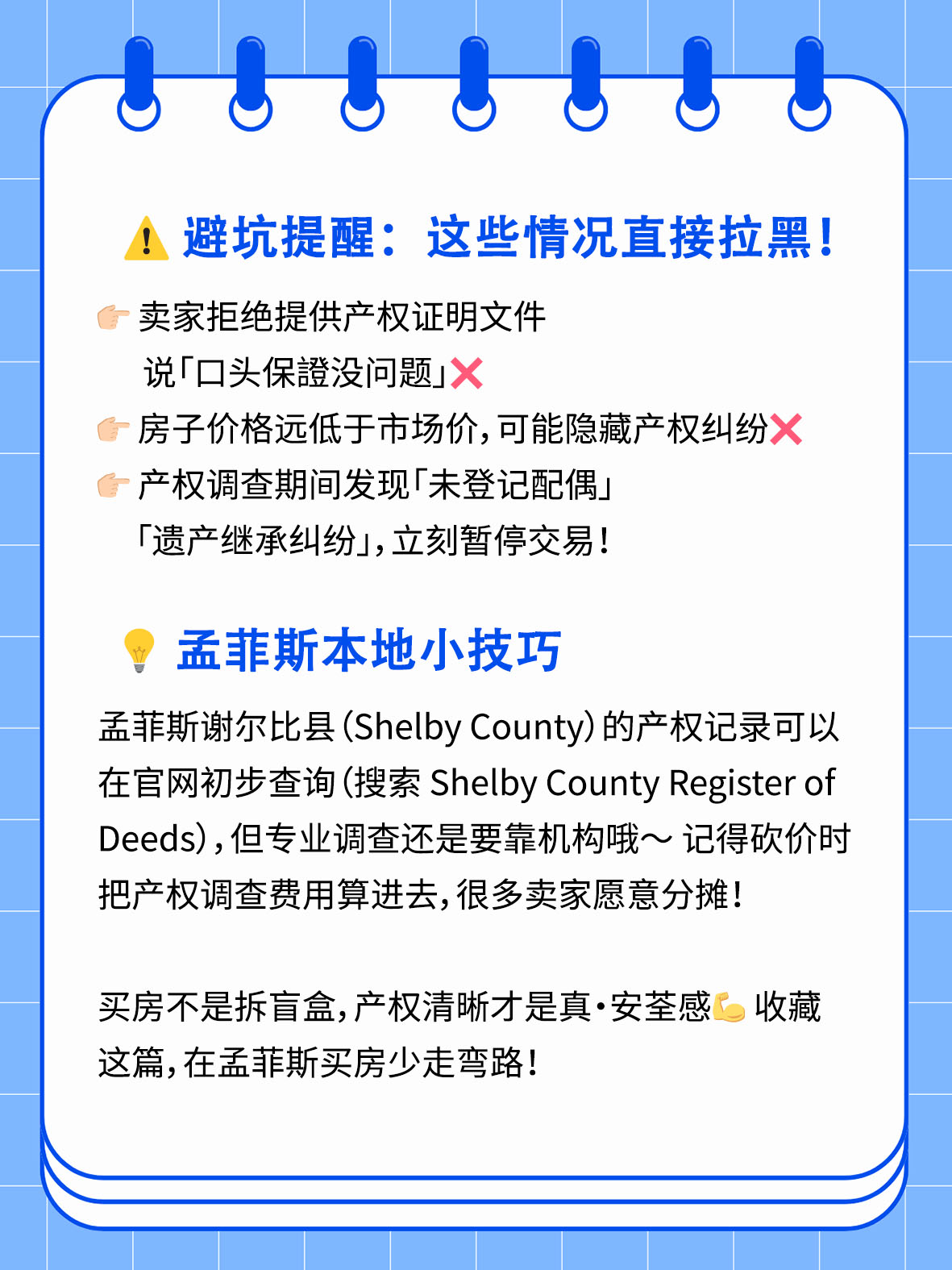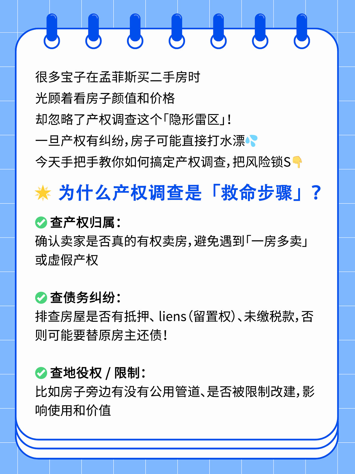 很多宝子在孟菲斯买二手房时,光顾着看房子颜值和价格,却忽略了产权调查这个「隐形雷区」!一旦产权有纠纷,房子可能直接打水漂💦 今天手把手教你如何搞定产权调查,把风险锁S👇