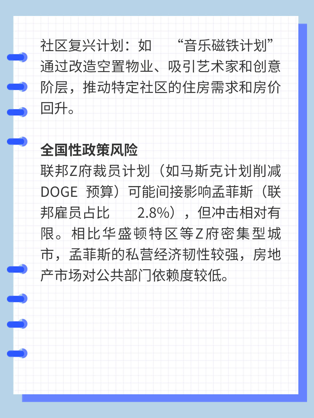 联邦Z府裁员计划(如马斯克计划削减 DOGE 预算)可能间接影响孟菲斯(联邦雇员占比 2.8%),但冲击相对有限。相比华盛顿特区等Z府密集型城市,孟菲斯的私营经济韧性较强,房地产市场对公共部门依赖度较低。