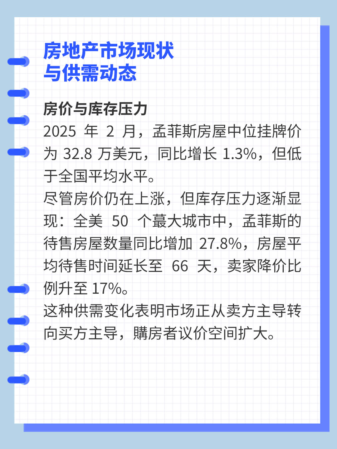 2025 年 2 月,孟菲斯房屋中位挂牌价为 32.8 万美元,同比增长 1.3%,但低于全国平均水平。尽管房价仍在上涨,但库存压力逐渐显现:全美 50 个蕞大城市中,孟菲斯的待售房屋数量同比增加 27.8%,房屋平均待售时间延长至 66 天,卖家降价比例升至 17%。这种供需变化表明市场正从卖方主导转向买方主导,購房者议价空间扩大。