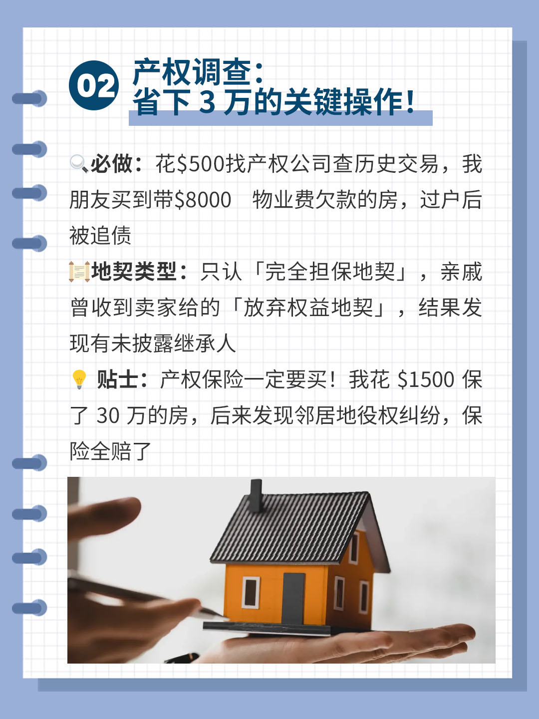 💡 贴士:产权保险一定要买!我花 $1500 保了 30 万的房,后来发现邻居地役权纠纷,保险全赔了