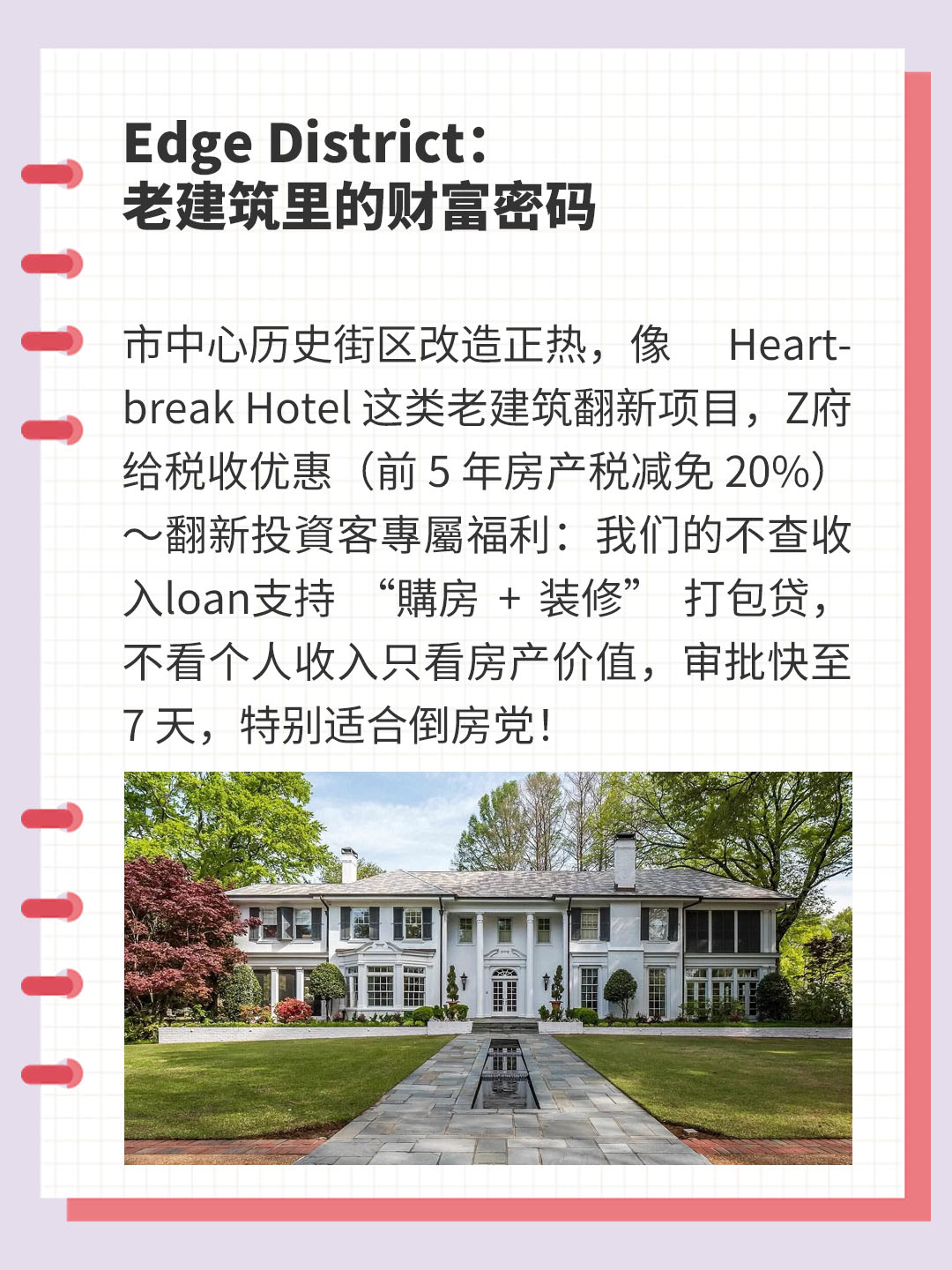 市中心历史街区改造正热,像 Heartbreak Hotel 这类老建筑翻新项目,Z府给税收优惠(前 5 年房产税减免 20%)~翻新投資客專屬福利:我们的不查收入loan支持 “購房 + 装修” 打包贷,不看个人收入只看房产价值,审批快至 7 天,特别适合倒房党!