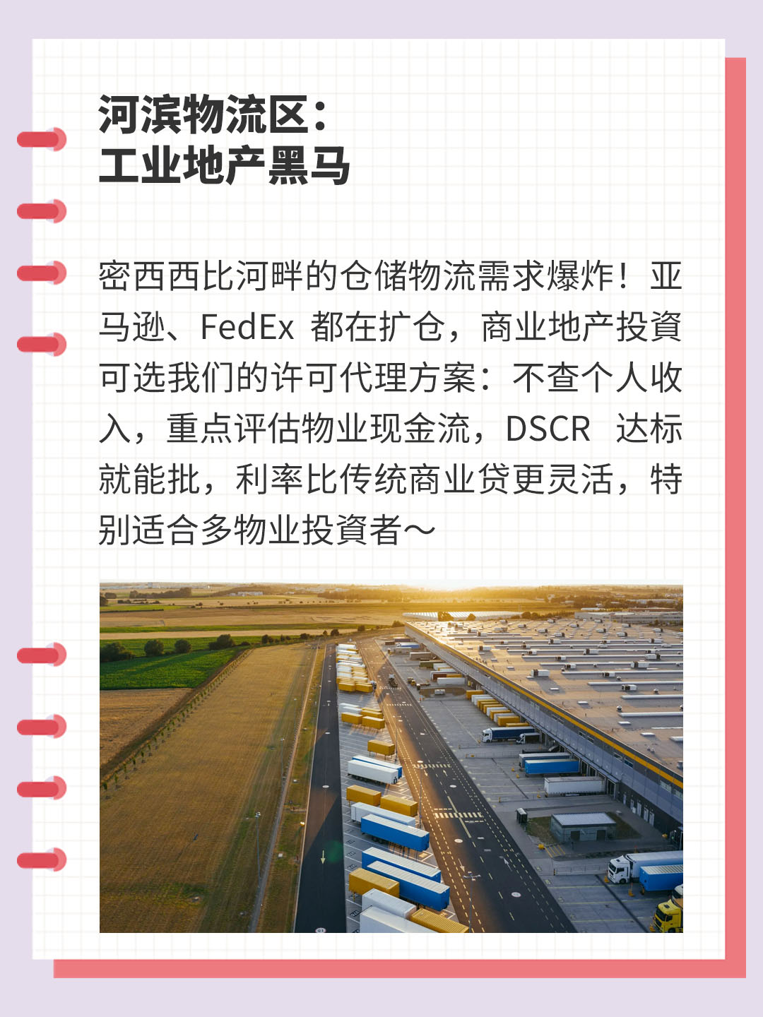 密西西比河畔的仓储物流需求爆炸!亚马逊、FedEx 都在扩仓,商业地产投資可选我们的许可代理方案:不查个人收入,重点评估物业现金流,DSCR 达标就能批,利率比传统商业贷更灵活,特别适合多物业投資者~