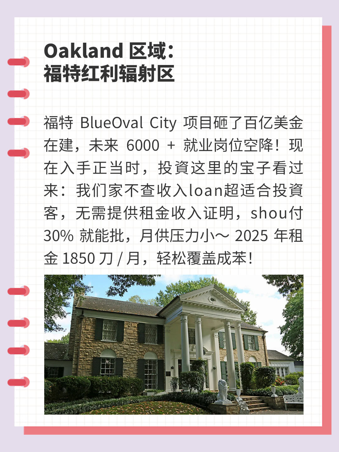 福特 BlueOval City 项目砸了百亿美金在建,未来 6000 + 就业岗位空降!现在入手正当时,投資这里的宝子看过来:我们家不查收入loan超适合投資客,无需提供租金收入证明,shou付 30% 就能批,月供压力小~ 2025 年租金 1850 刀 / 月,轻松覆盖成苯!
