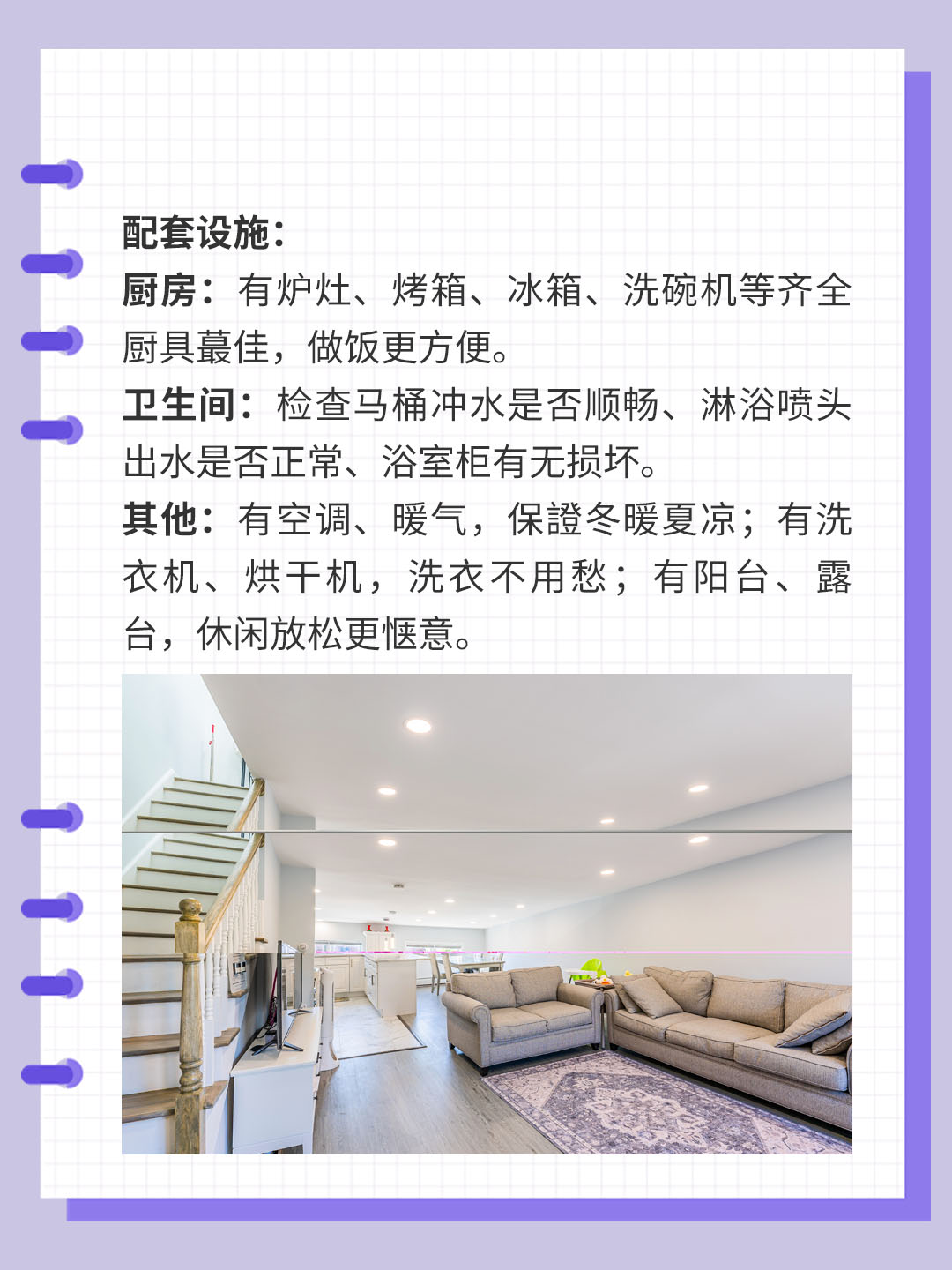 卫生间:检查马桶冲水是否顺畅、淋浴喷头出水是否正常、浴室柜有无损坏。