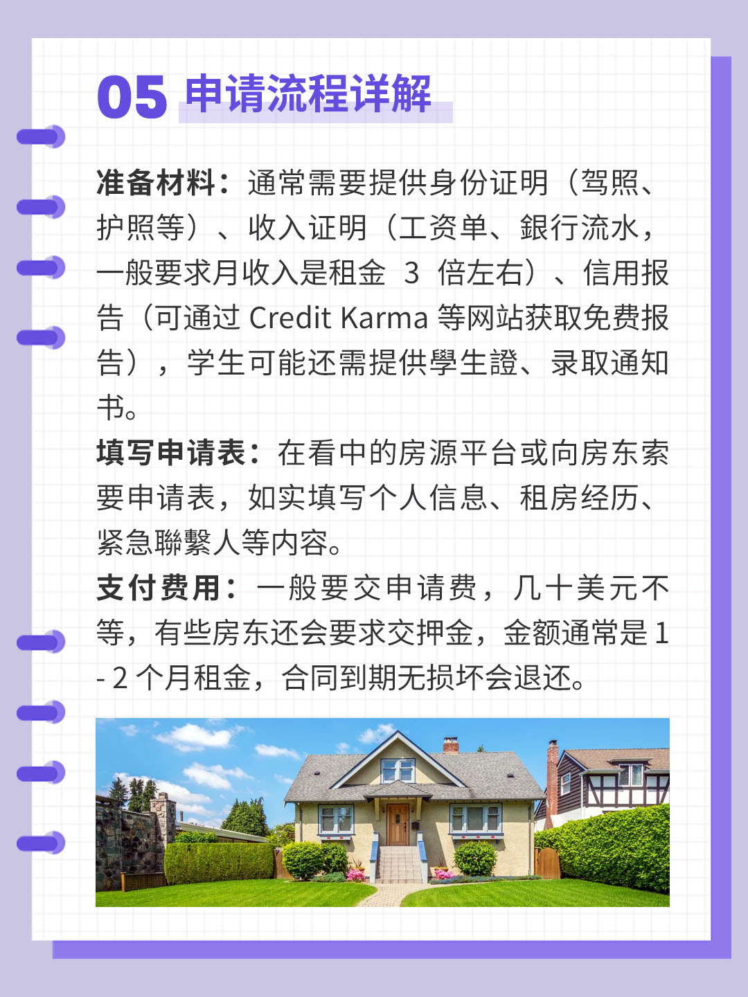 准备材料:通常需要提供身份证明(驾照、护照等)、收入证明(工资单、銀行流水,一般要求月收入是租金 3 倍左右)、信用报告(可通过 Credit Karma 等网站获取免费报告),学生可能还需提供學生證、录取通知书。