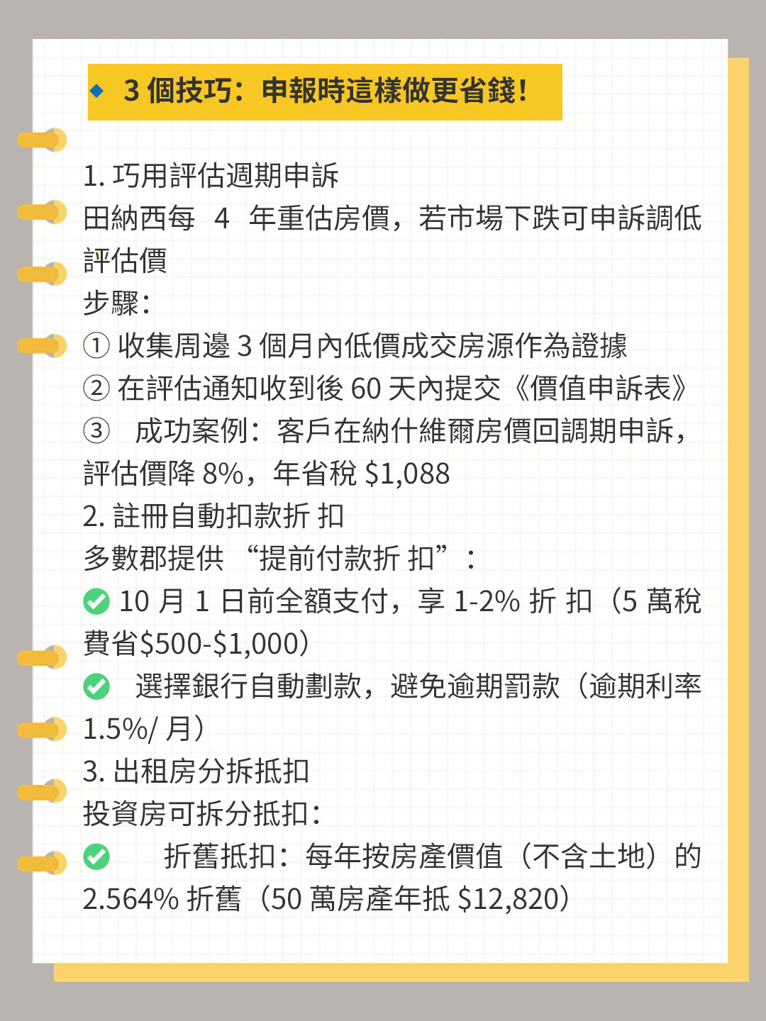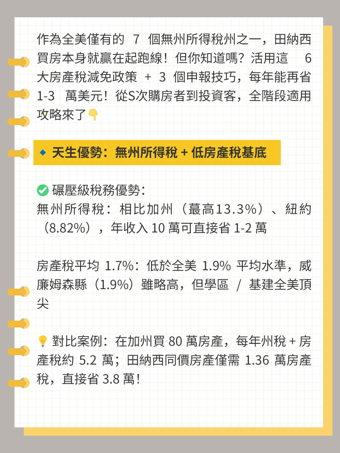 作為全美僅有的 7 個無州所得稅州之一,田納西買房本身就贏在起跑線!但你知道嗎?活用這 6 大房產稅減免政策 + 3 個申報技巧,每年能再省 1-3 萬美元!從S次購房者到投資客,全階段適用攻略來了👇
