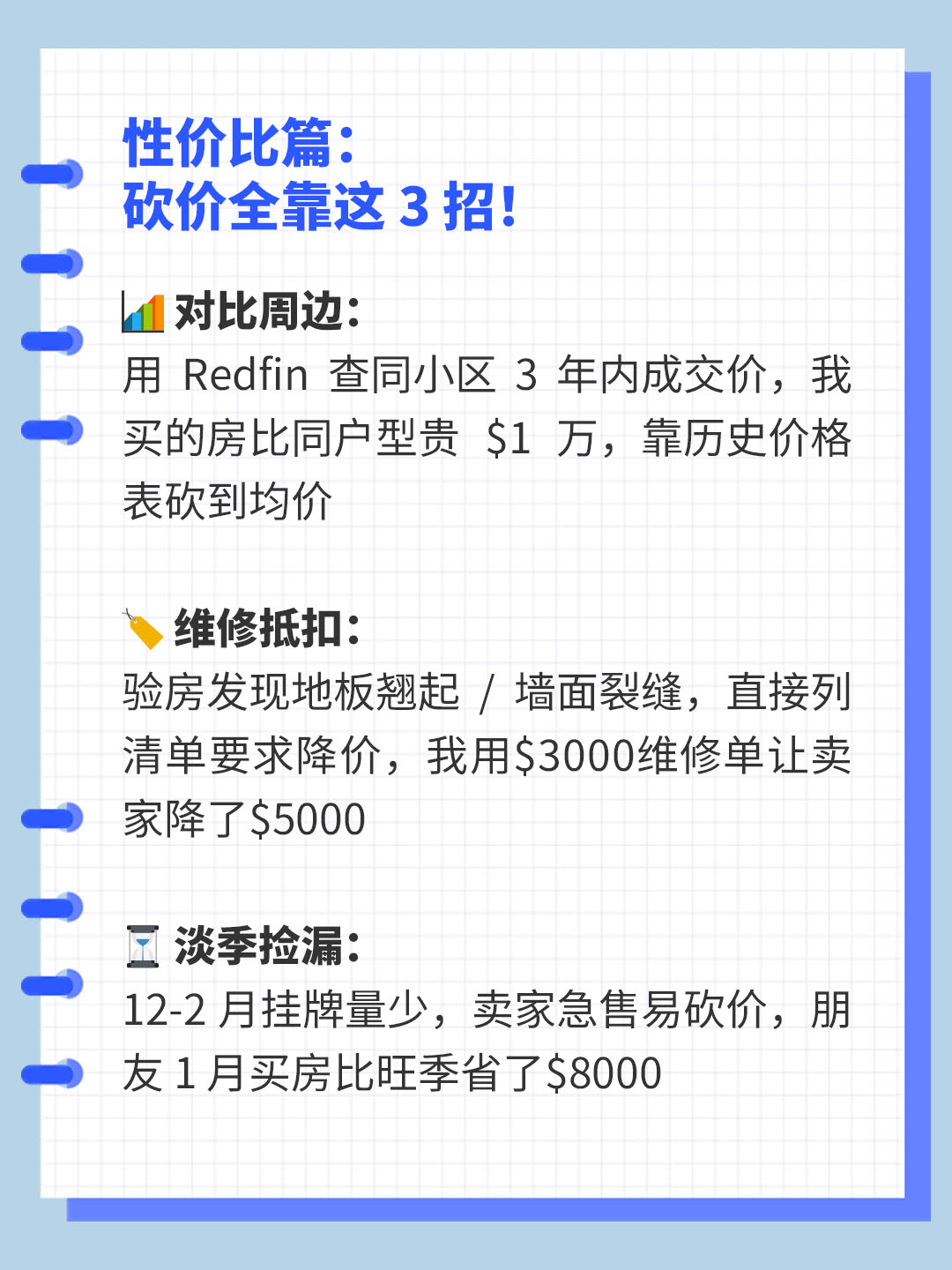 🏷️ 维修抵扣:验房发现地板翘起 / 墙面裂缝,直接列清单要求降价,我用$3000维修单让卖家降了$5000