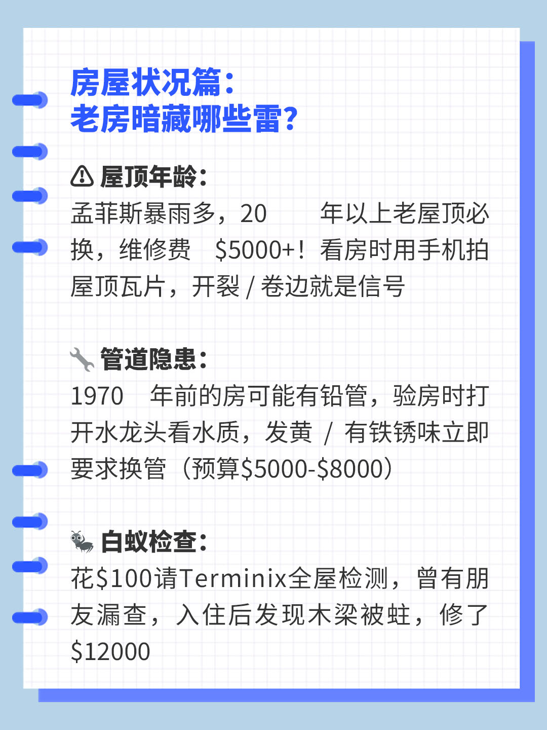 🔧 管道隐患:1970 年前的房可能有铅管,验房时打开水龙头看水质,发黄 / 有铁锈味立即要求换管(预算$5000-$8000)