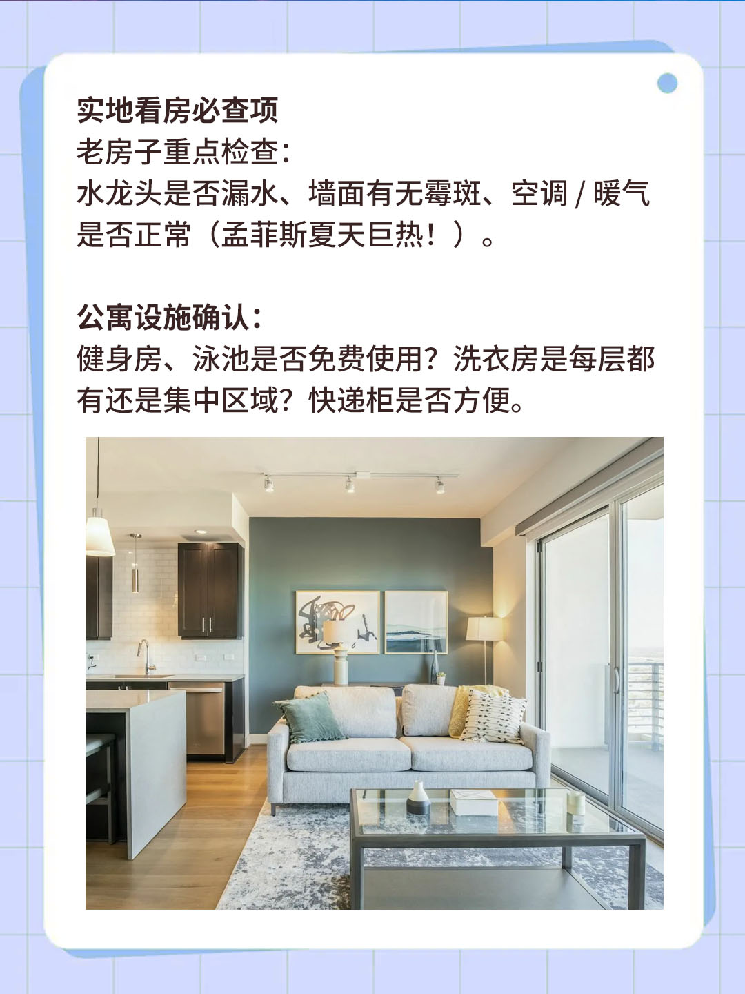 老房子重点检查:水龙头是否漏水、墙面有无霉斑、空调 / 暖气是否正常(孟菲斯夏天巨热!)。