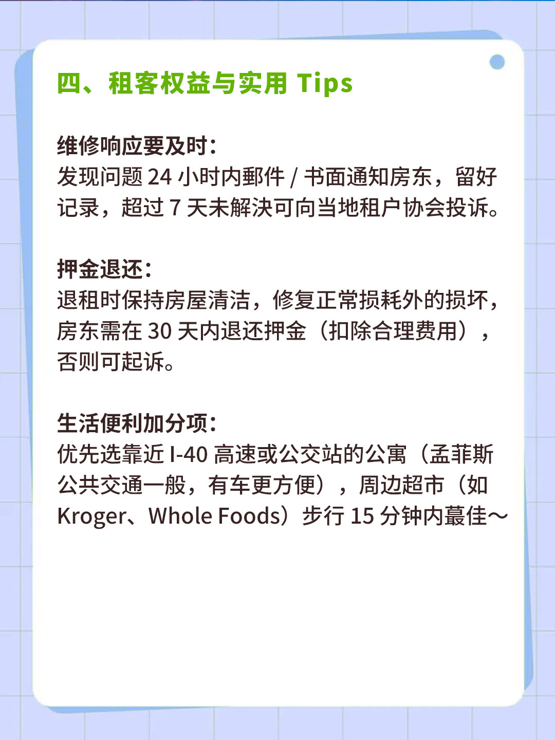 维修响应要及时:发现问题 24 小时内郵件 / 书面通知房东,留好记录,超过 7 天未解決可向当地租户协会投诉(孟菲斯租房法规偏向保护租客)。