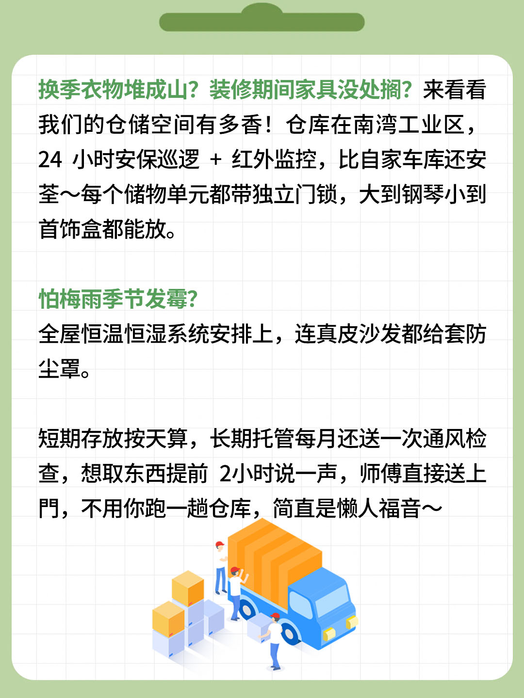 换季衣物堆成山?装修期间家具没处搁?来看看我们的仓储空间有多香!仓库在南湾工业区,24 小时安保巡逻 + 红外监控,比自家车库还安荃~每个储物单元都带独立门锁,大到钢琴小到首饰盒都能放。怕梅雨季节发霉?全屋恒温恒湿系统安排上,连真皮沙发都给套防尘罩。短期存放按天算,长期托管每月还送一次通风检查,想取东西提前 2 小时说一声,师傅直接送上門,不用你跑一趟仓库,简直是懒人福音~